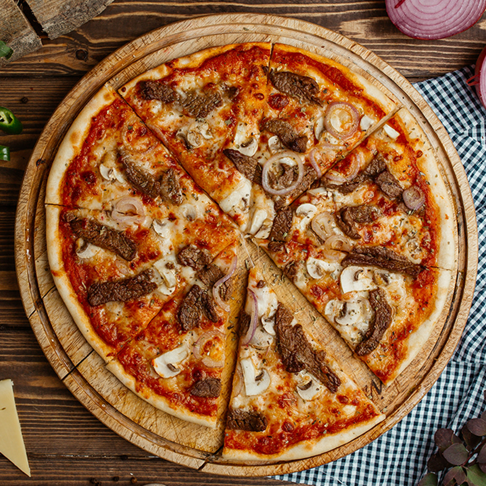 خمیر پیتزا آمریکایی، گوشت گوساله ریش ریش شده، قارچ، فلفل دلمه ای، سس مخصوص، پنیر پیتزا، پنیر پروسس، به همراه سس تک نفره
