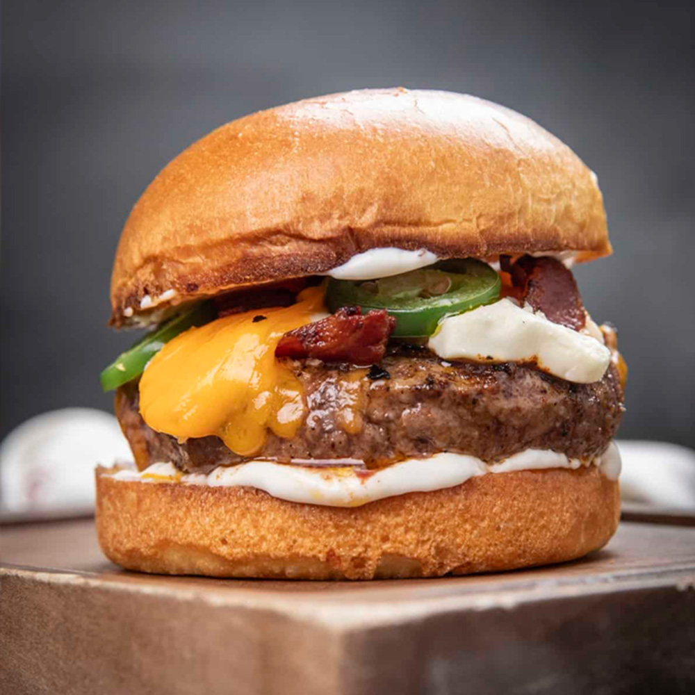 یک عدد برگر دست ساز گوشت گوساله گریل شده ۱۰۰%، فلفل هالوپینو، سیب زمینی سرخ شده، گوجه، کاهو، خیارشور، سس مخصوص، سس تک نفره، نان گرد