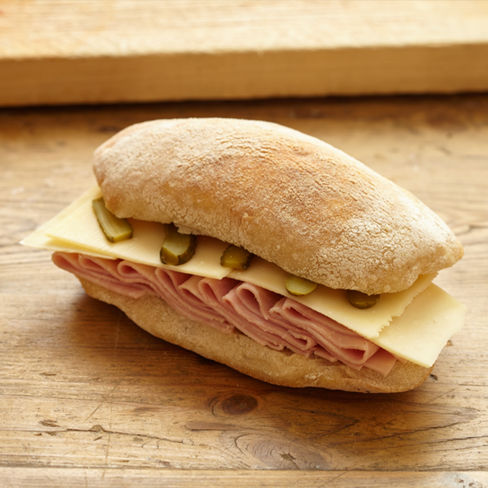 یک ورق ژامبون گوشت ۸۰%، یک ورق ژامبون مرغ ۸۰%، پنیر پیتزا، چیپس خلالی، کاهو، گوجه، خیارشور، سس مخصوص، نان فرانسوی