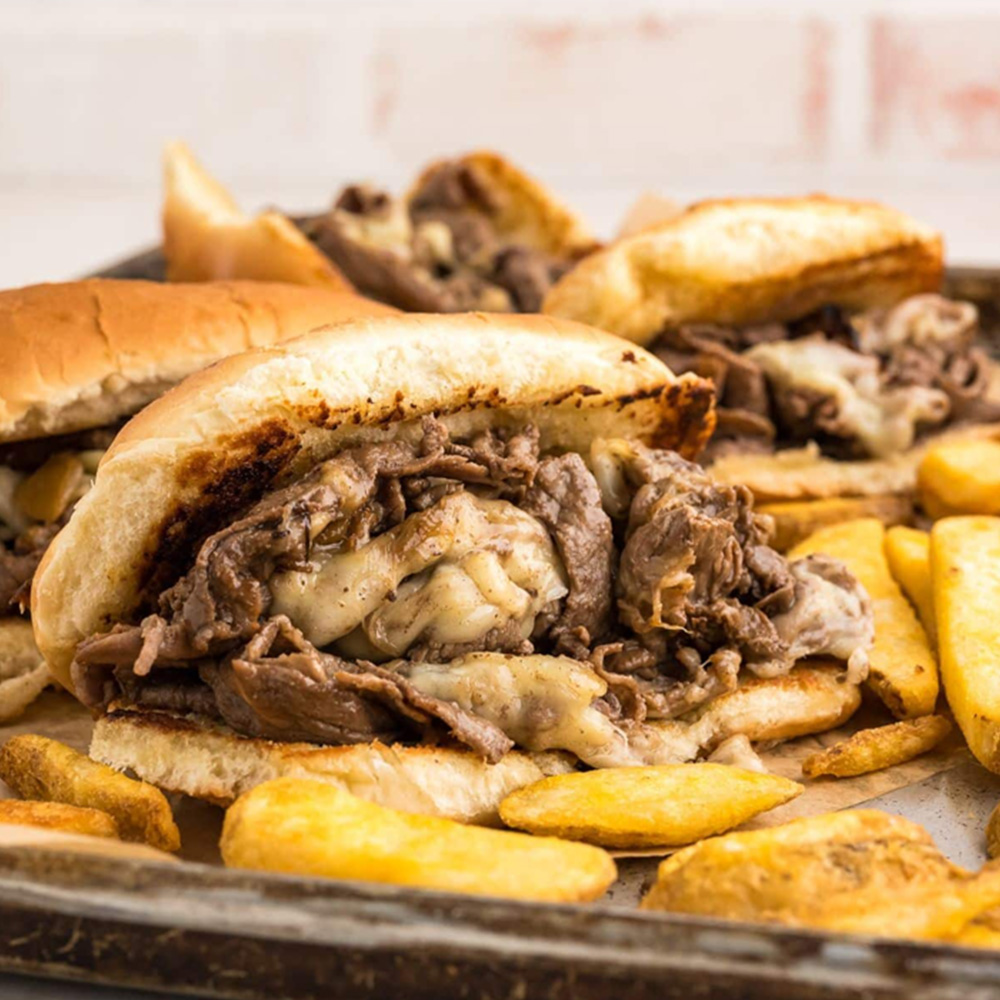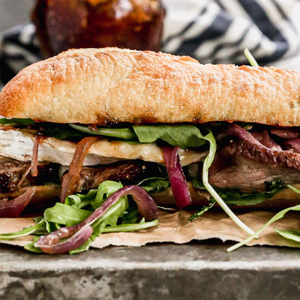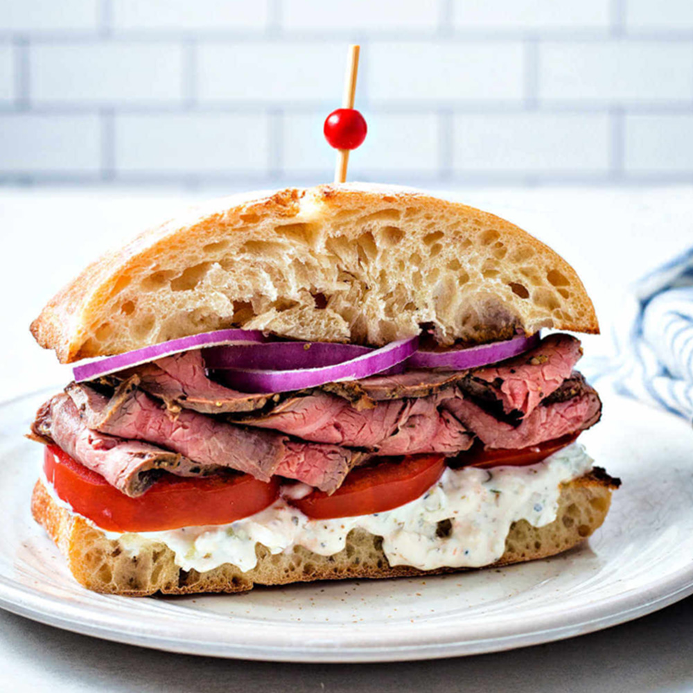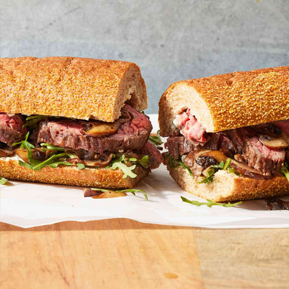 گوشت فیله گوساله، قارچ، پیاز، کاهو، گوجه، خیارشور، سس آلفردو، نان فرانسوی